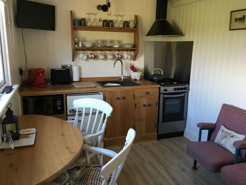 With a hand-built fitted oak kitchen supplying full size gas cooker, microwave, retro fridge with freezer, compact coffee machine and toaster, the living area also provides a dining table, two pretty carver chairs and a quirky addition of three vintage cinema seats giving a unique interesting touch. A television with built-in DVD is also supplied. Rustic industrial lighting provides a cosy feel and the accommodation which is centrally heated comes fully equipped with everything you need for a relaxing stay.